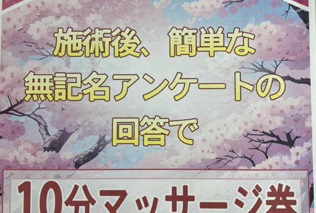 マッサージか鍼灸2000円以上の施術で、10分マッサージをサービス! キャンペーン期間: R7……