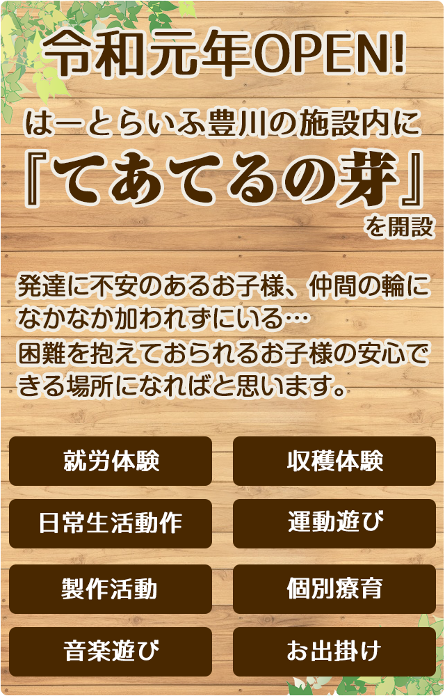 「てあてるの芽」では、障がい児の支援から自立支援、就労支援へ繋げていく、就労準備型の支援を考えています。