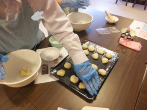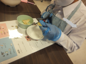そして、馴染むと丸く形作り。栄養士さんの見本を見ながら、「なにか違うな」「これは近くできたかも」と