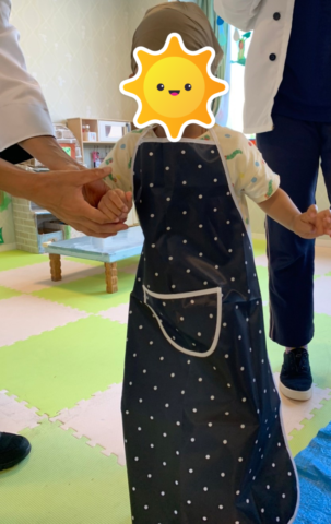 エプロン、バンダナをつけ、職員皆から「かっこいいー」と褒められると