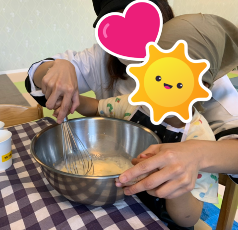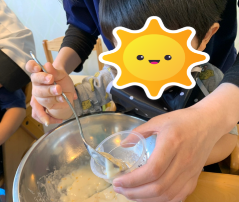 職員が子ども達の手を添えながら、混ぜ方の動作を知らせると自分で行う子も。