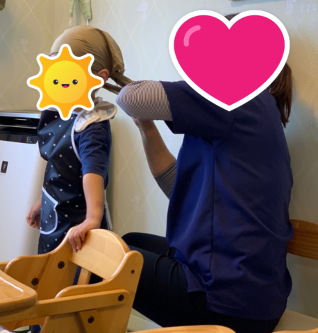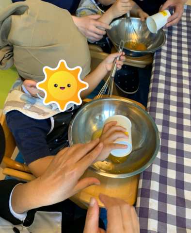 職員が子ども達の手を添えながら、混ぜ方の動作を知らせると自分で行う子も。