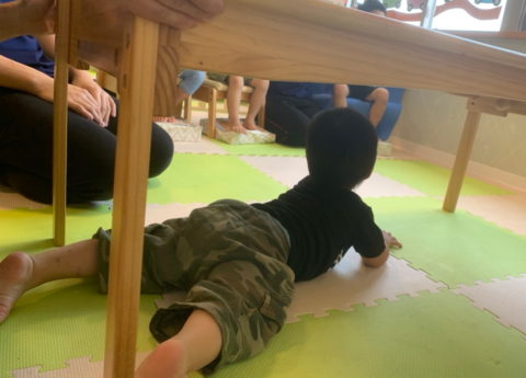 「机の下にもぐった時はダンゴムシに変身するとかっこいいよ」と職員がさらに伝えると