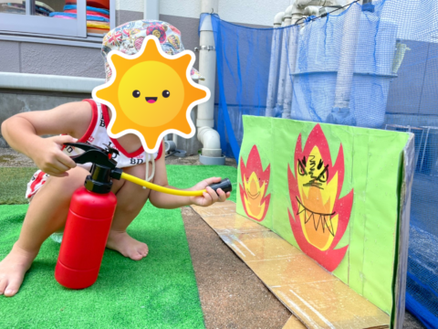 火をめがけて「しゅー」と言いながらまるで消防士さんになり切っていました。