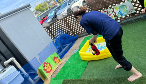 火をめがけて「しゅー」と言いながらまるで消防士さんになり切っていました。