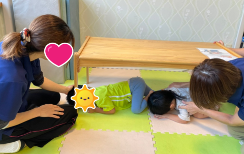「机の下にもぐった時はダンゴムシに変身するとかっこいいよ」と職員がさらに伝えると